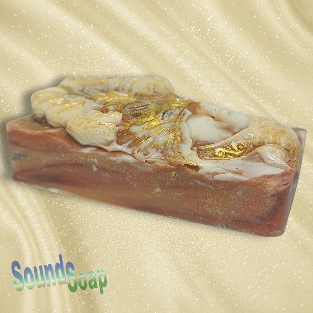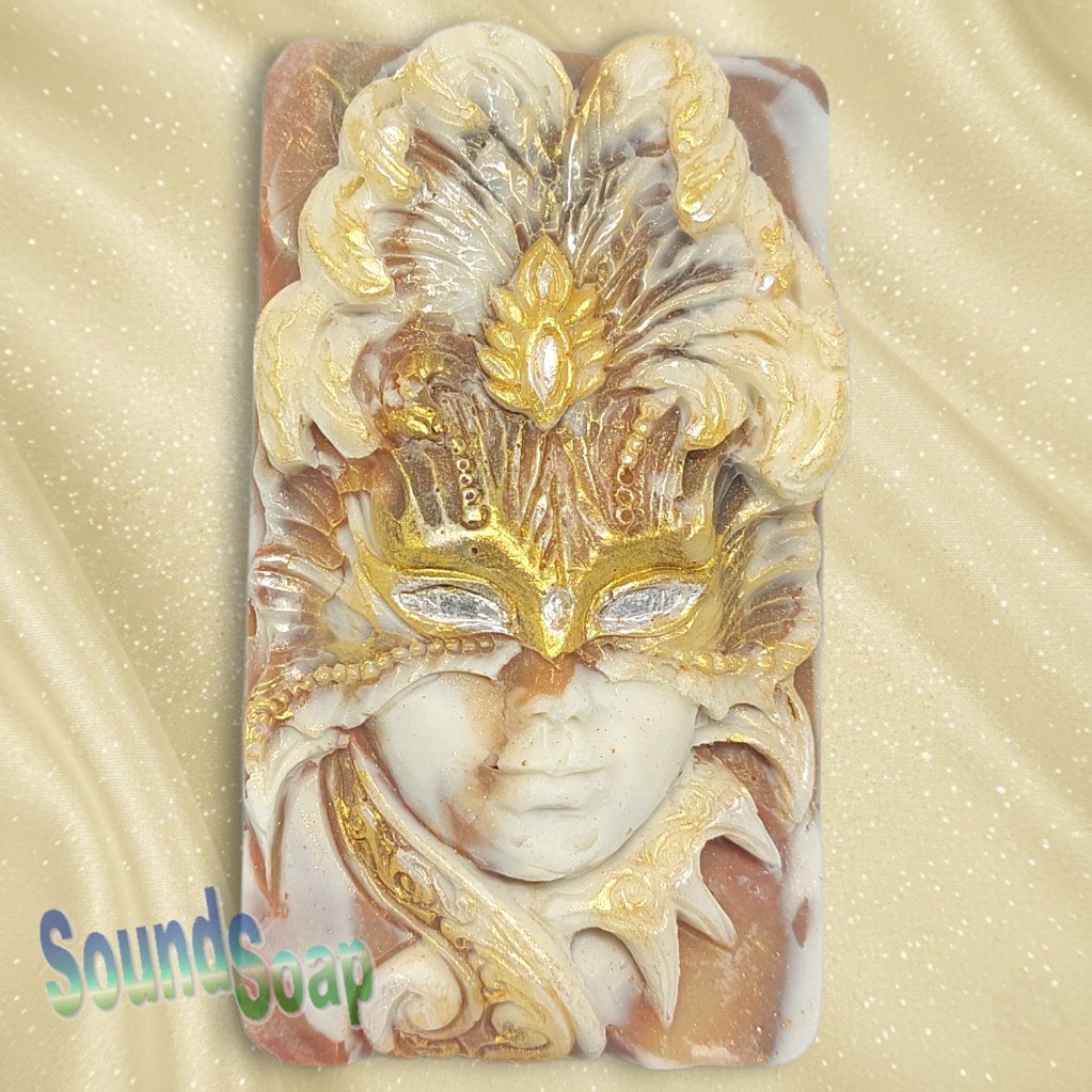 An elegant artisan soap bar featuring a detailed masquerade mask.