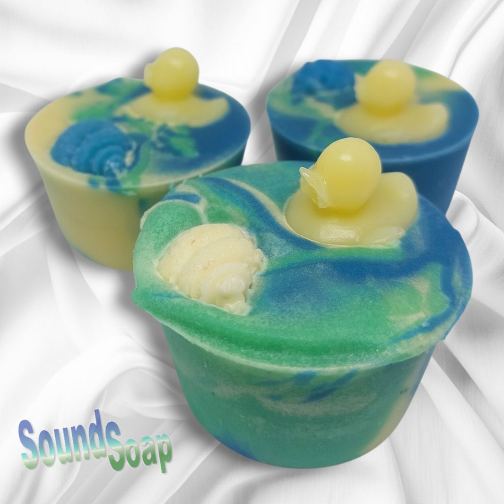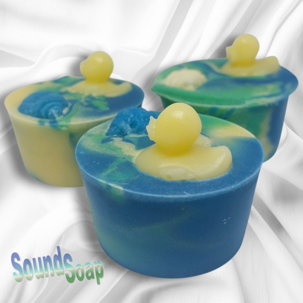 Splish Splash - Cheeky Ducky Soaps: Fun, fragrant, and gentle on the skin! These unique mini-soaps feature a yellow ducky and a shell (made out of soap too) floating on a vibrant, swirled base. Perfect for kids (and adults!) who love a little extra fun in their bathtub.