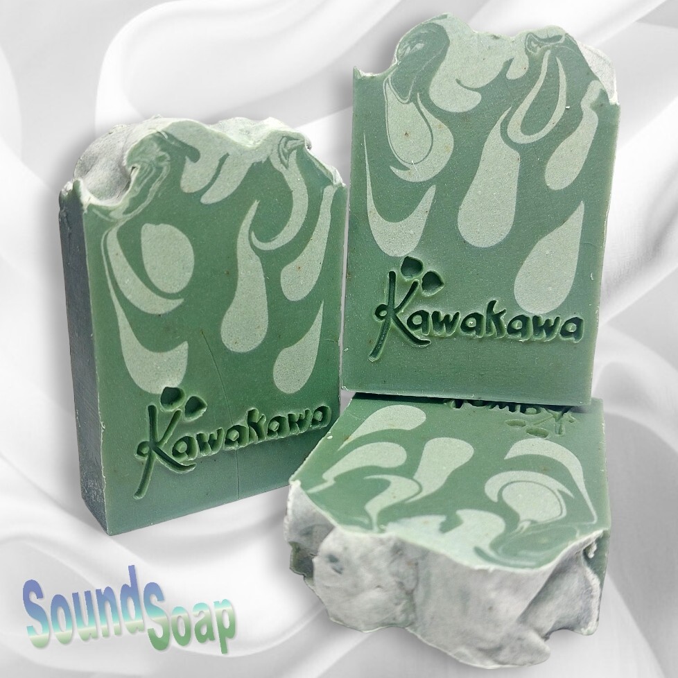 Saponified oils: (Tallow, Coconut Oil, Olive Oil, Rice Bran Oil, Castor Oil). Kawakawa tea, glycerine, (Kawakawa + spirulina powder used in oil infusion), Fragrance oil, Citric Acid, Sugar, Mica
