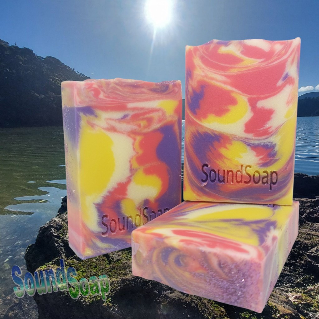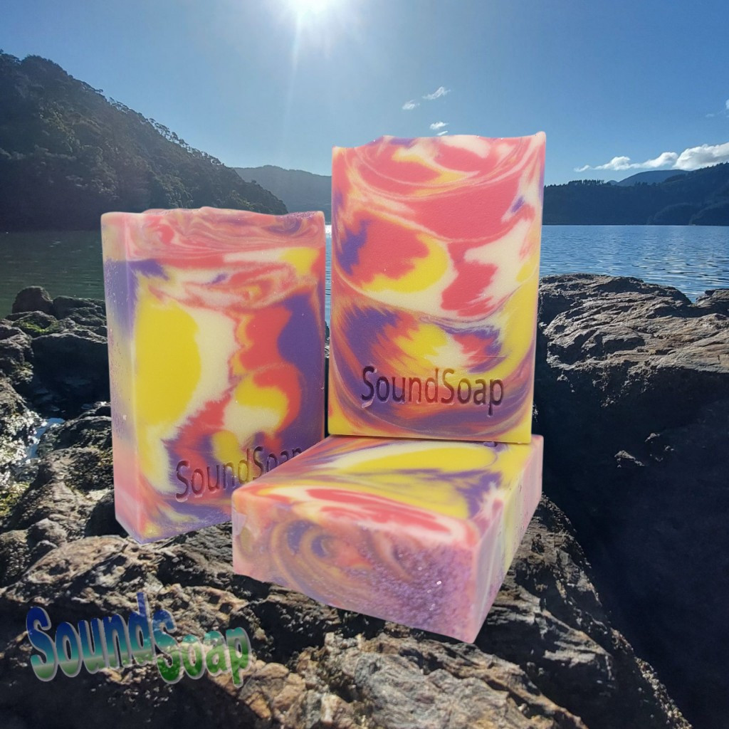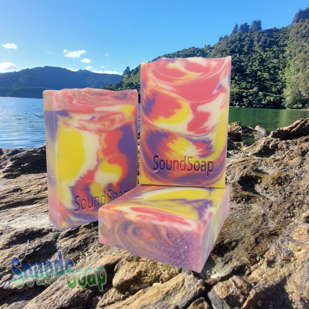 I tried to recreate the beauty of a Marlborough Sounds Sunset in this soap. Its vibrant colours are matched by a rich fragrance that blends the aroma of incense with a burst of zesty, sun-ripened lemon—like a radiant glow at dusk.